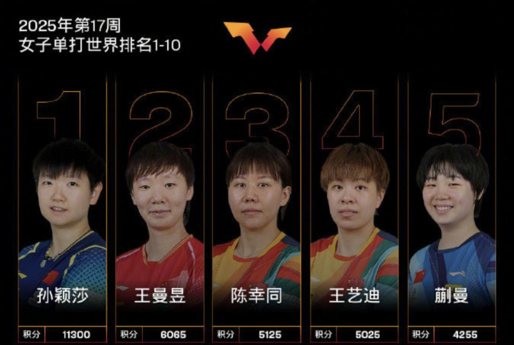 对比之下女单方面则是比较争气,国乒包揽了前五名,其中孙颖莎以11300分继续排名世界第一。王曼昱、陈幸同、王艺迪和蒯曼则是排在第2名到第5名,其中蒯曼的成绩相当出色,她上升两个名次排到第5名,首次进入世界排名前五也刷新了他个人职业生涯最好的成绩,打破了记录。对于蒯曼来说,这应该是一个小小的安慰。